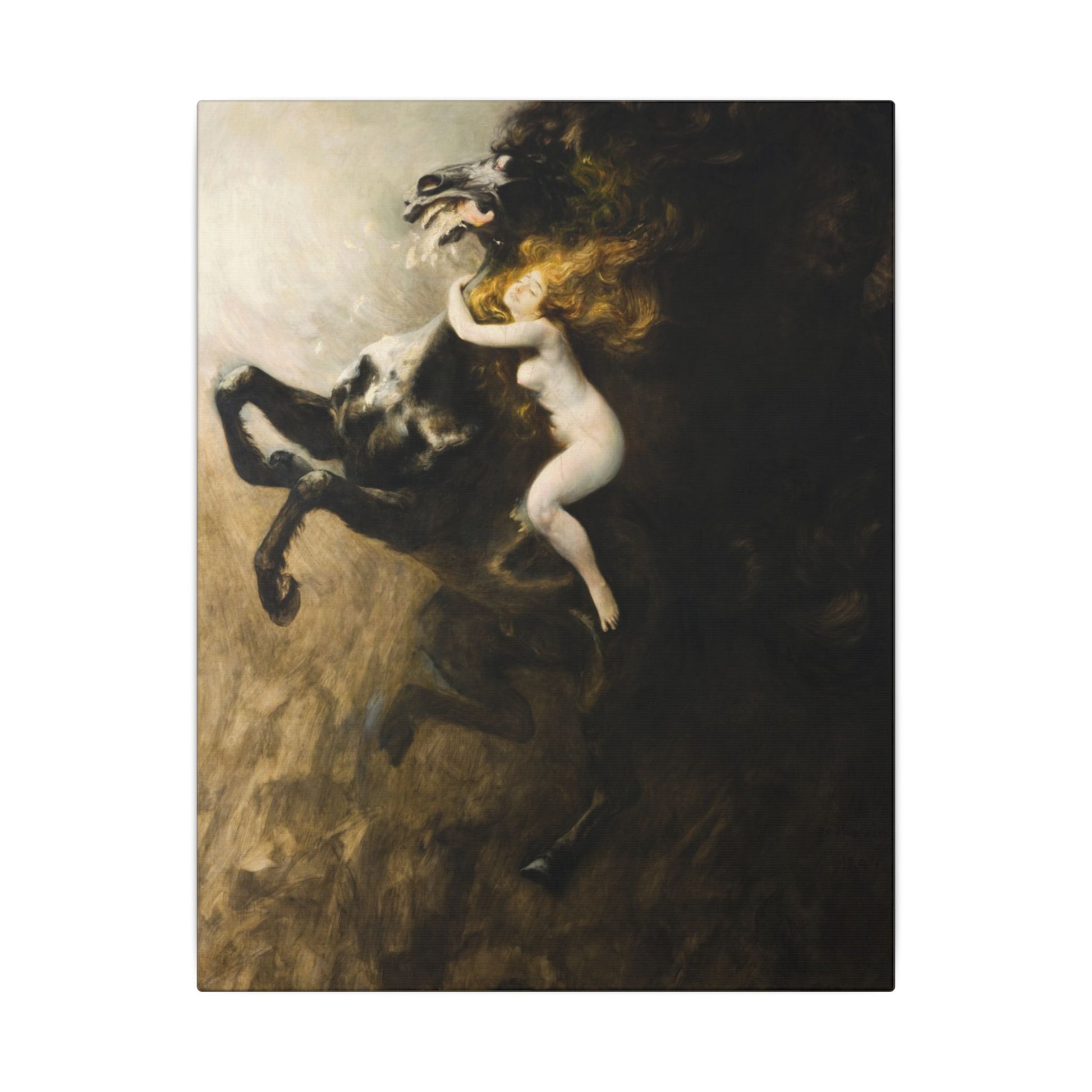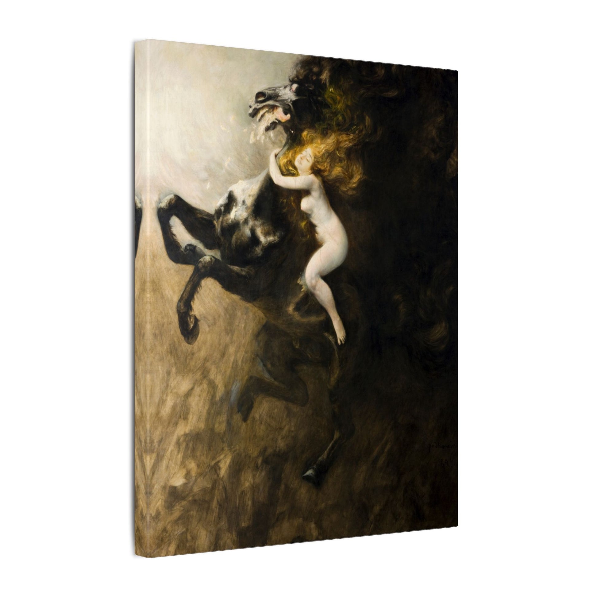 Władysław Podkowiński’s Szał (Frenzy) is a storm of passion, violence, and unrestrained energy. A nude, flame-haired woman clings to the neck of a black, foaming horse, her eyes closed as if surrendering to ecstasy or terror. The horse rears in a frenzy, teeth bared, nostrils flaring, its wild mane entangled with the woman’s hair. Light sears the figures against a vortex of shadow, pulling the viewer into a world where desire and destruction are inseparably bound.