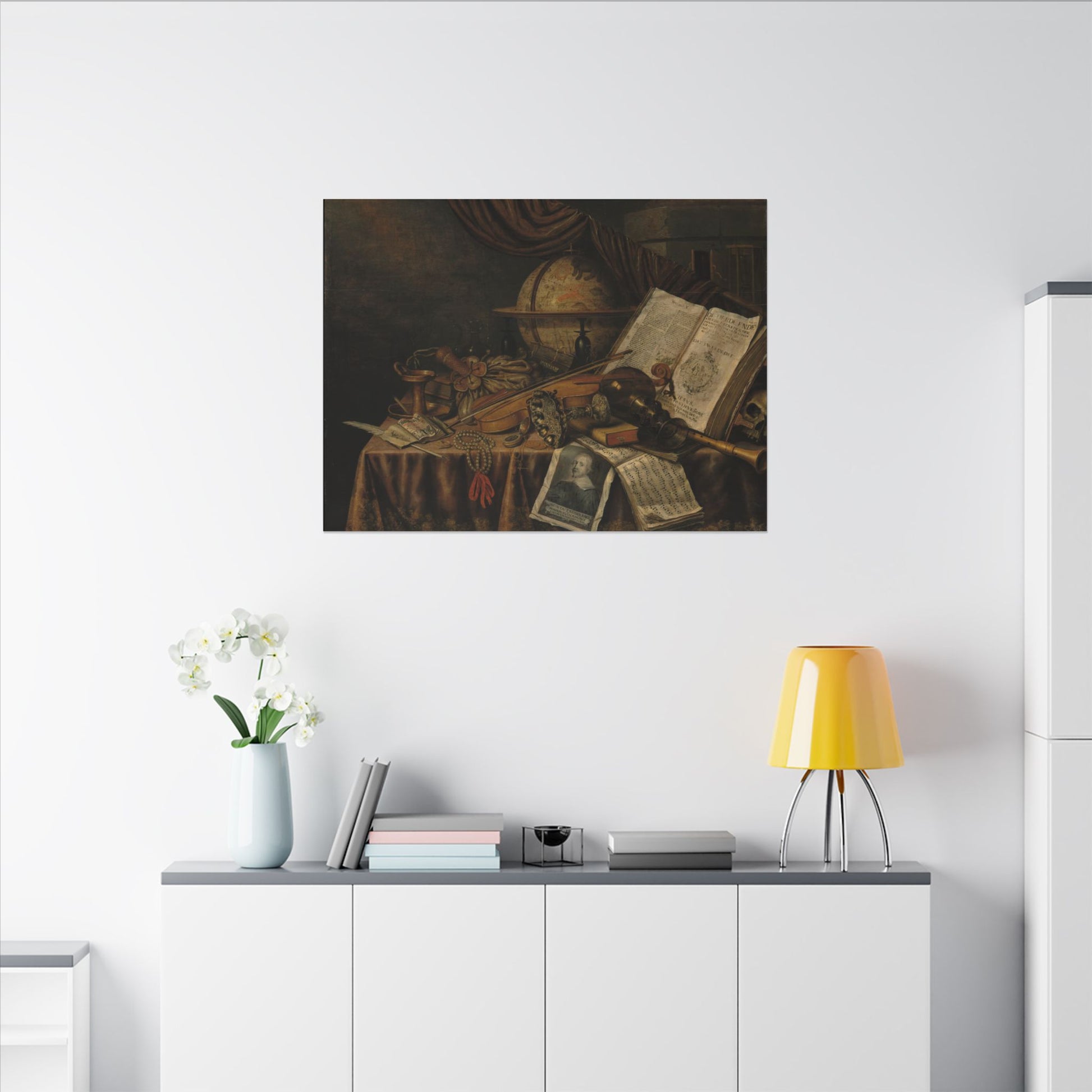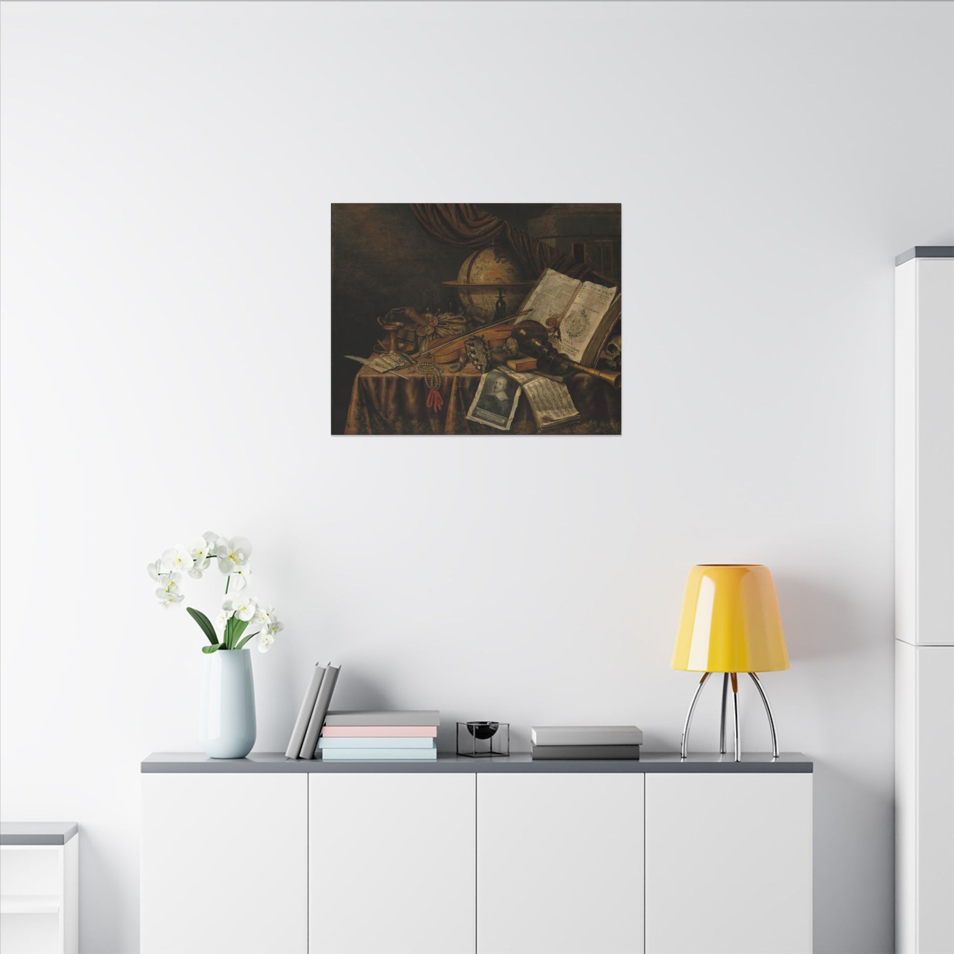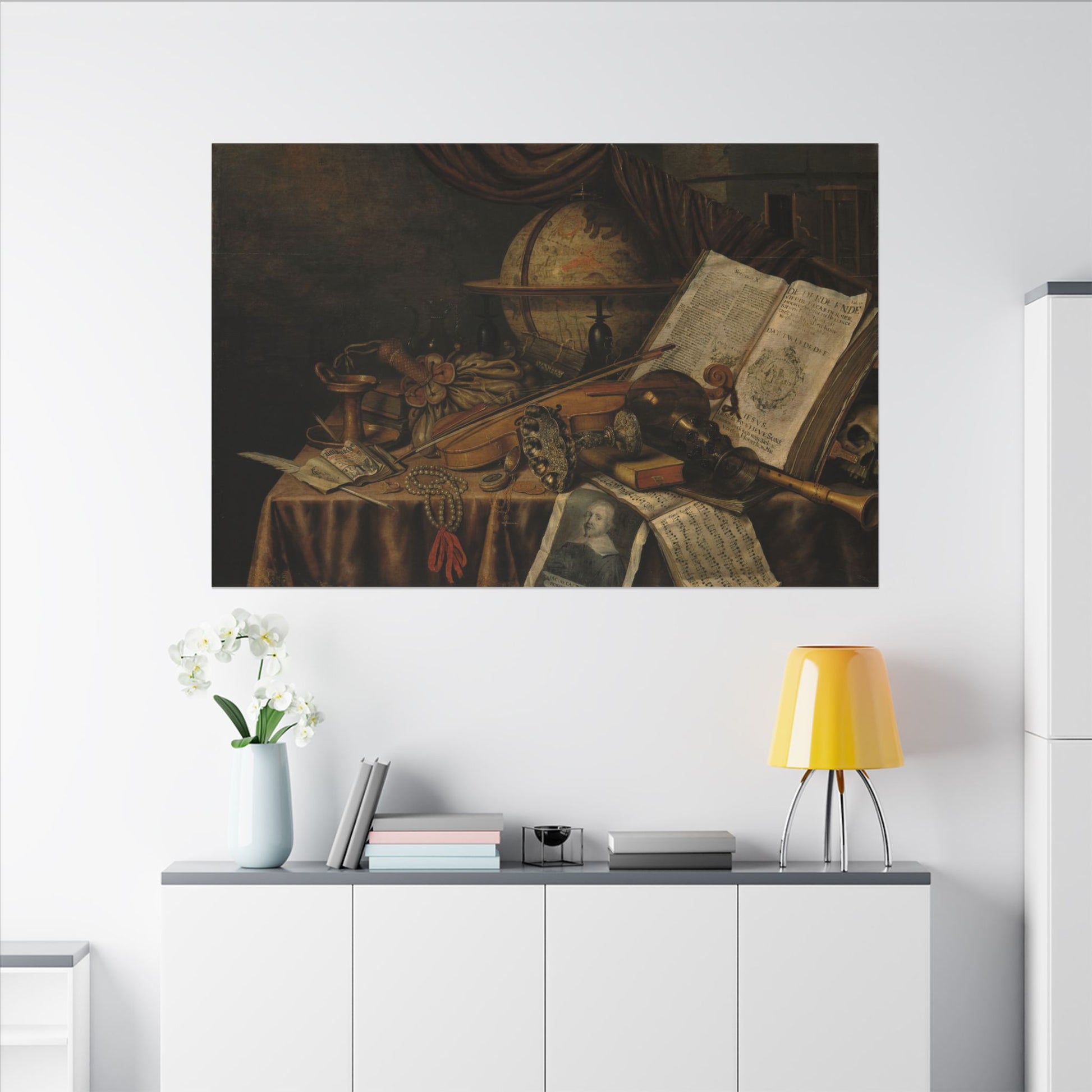 Edwaert Collier’s Vanitas Still Life is both a marvel of illusion and a meditation on ambition’s limits. With meticulous precision, Collier renders a segment of Frederik de Wit’s 1660 map of the Americas and Jodocus Hondius’s terrestrial globe—symbols of the Dutch Republic’s far-reaching trade networks and the 17th century’s hunger to chart and claim the world. Yet alongside these emblems of exploration and mastery, he places the extinguished candle and the hourglass, stark reminders that time erodes even the grandest human achievements.