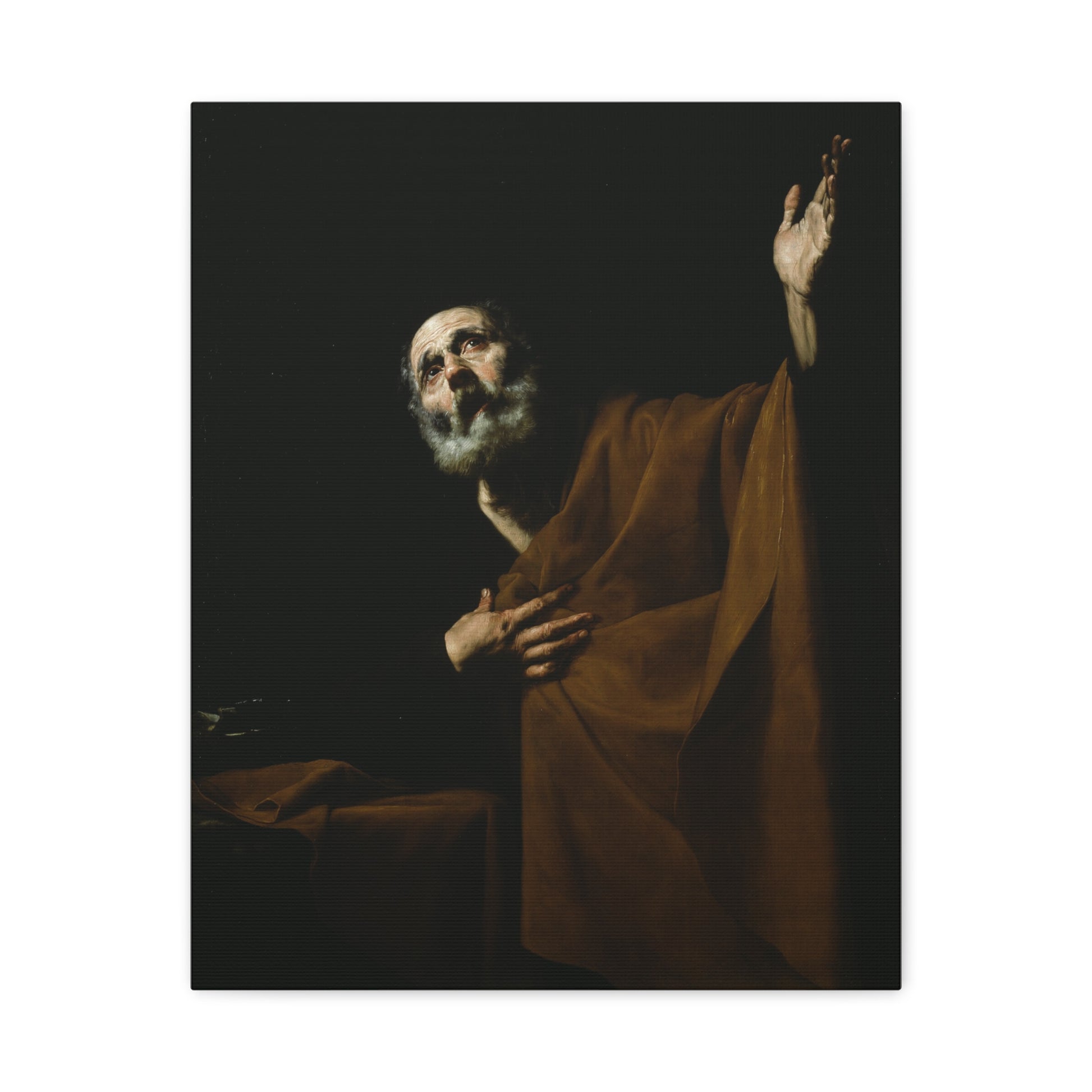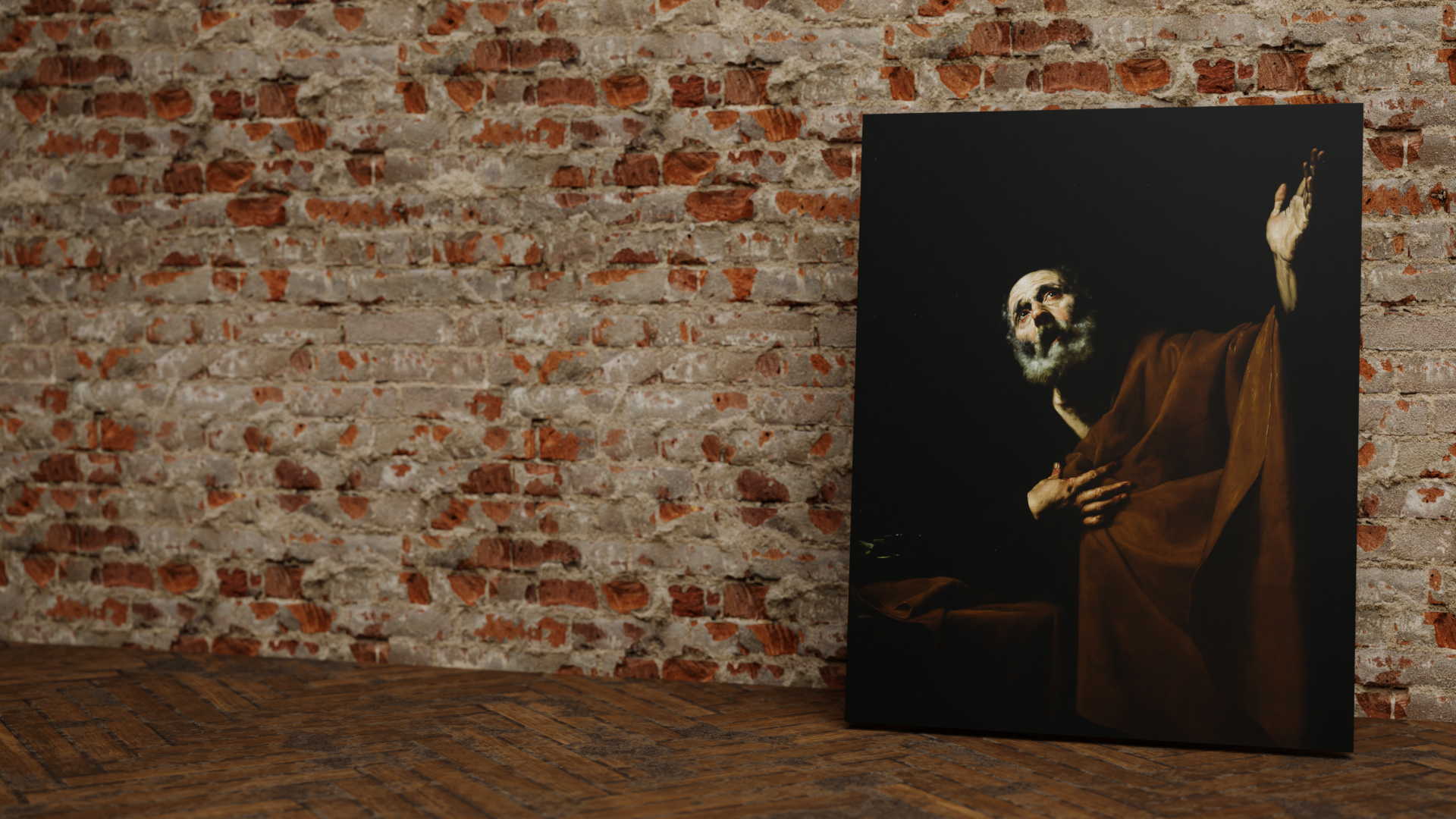 Emerging from shadow into a radiant light streaming from above, Saint Peter’s uplifted gaze and expressive gesture capture a moment of profound spiritual exchange, as he wrestles with the deep remorse of denying Christ.