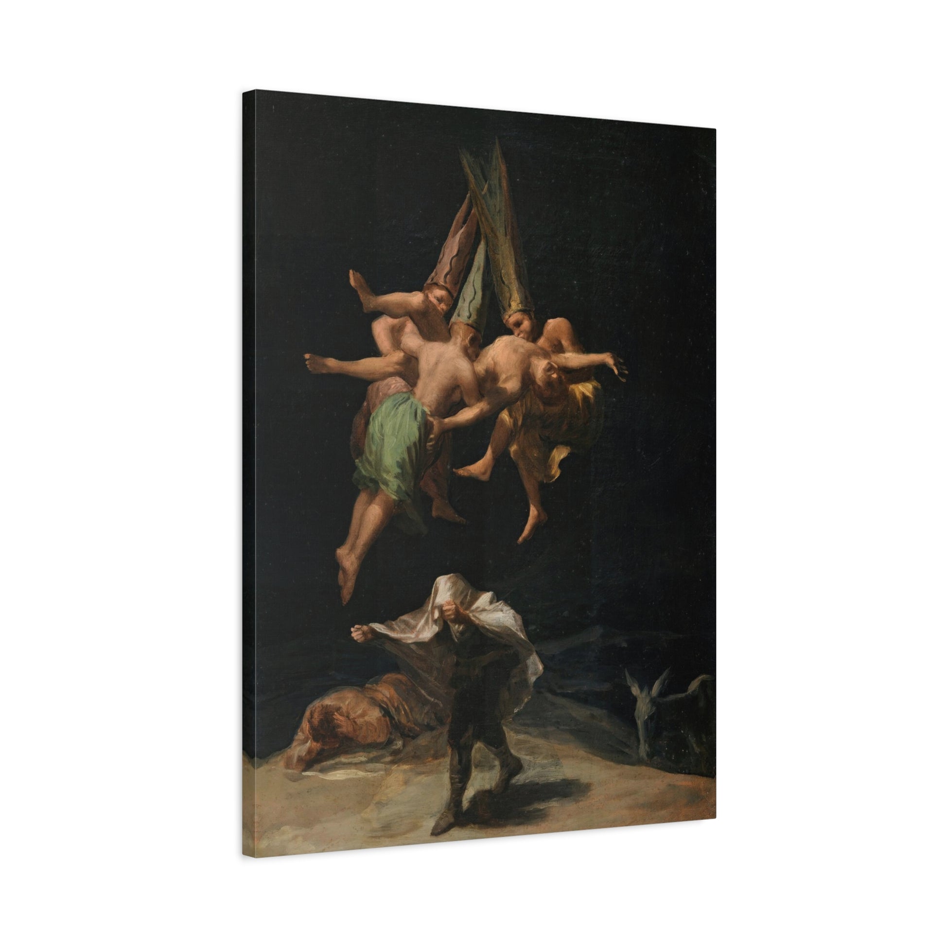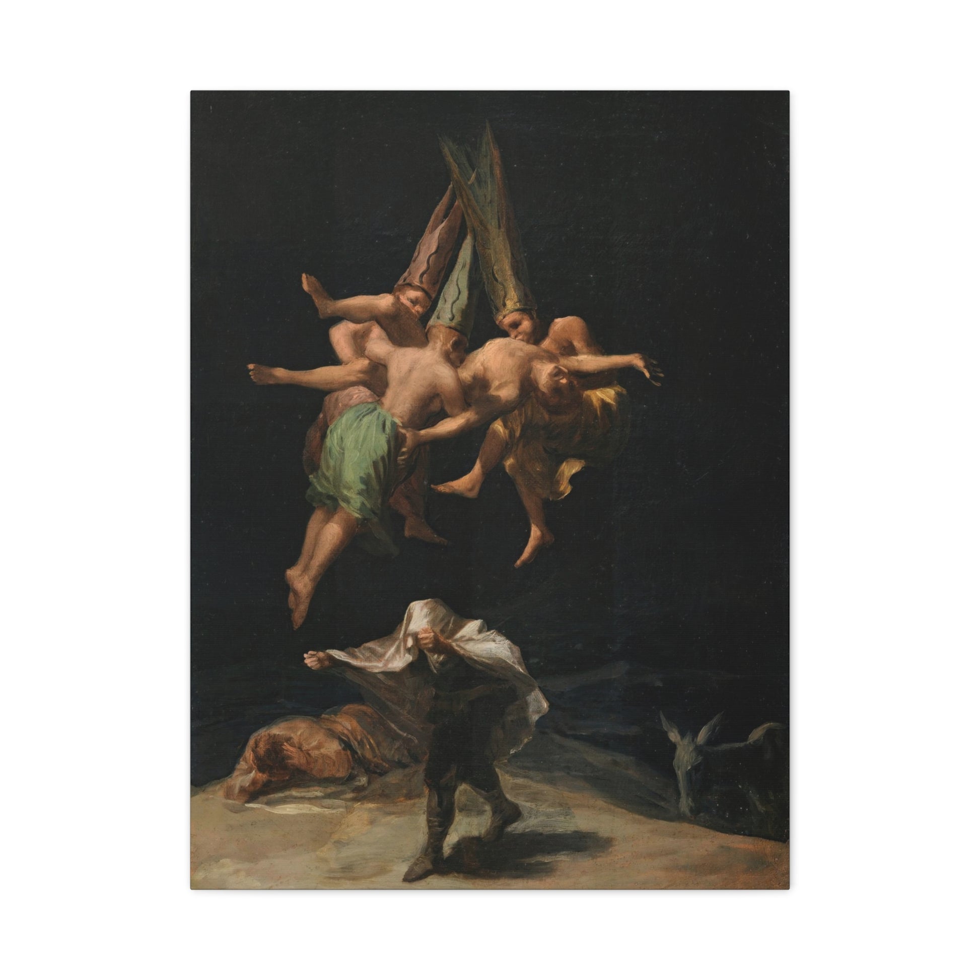 Francisco Goya’s Witches in the Air is a vision charged with dark wit and biting social commentary. Three witches, clad in iconic conical hats, levitate a writhing figure through the moonlit air, enacting a strange ritual that is equal parts menacing and absurd. Below, a terrified man shrouds his head in a desperate attempt to ward off evil, while a donkey—Goya’s frequent symbol for human folly—watches from the shadows, embodying the ridiculousness of superstition.