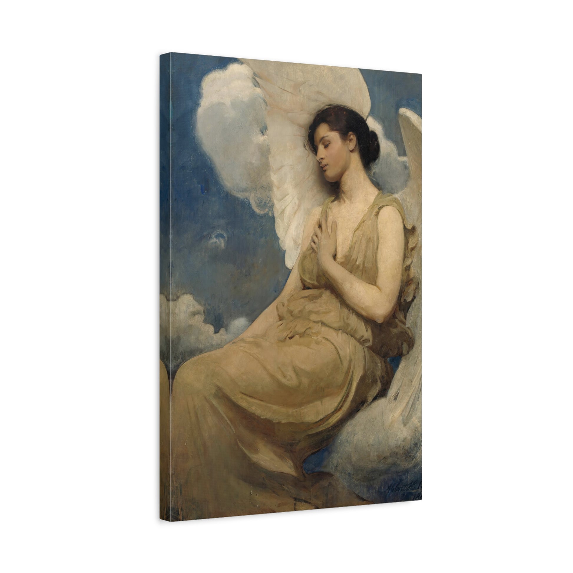 Abbott Handerson Thayer’s Winged Figure (1889) presents an ethereal vision suspended between the earthly and the divine. A lone, winged woman stands frontally, luminous and still, her white robe and sweeping wings radiating purity and restraint. Thayer renders the figure with soft realism, allowing light to pool gently across her form while the dark, minimal background isolates her in a timeless, sacred space.